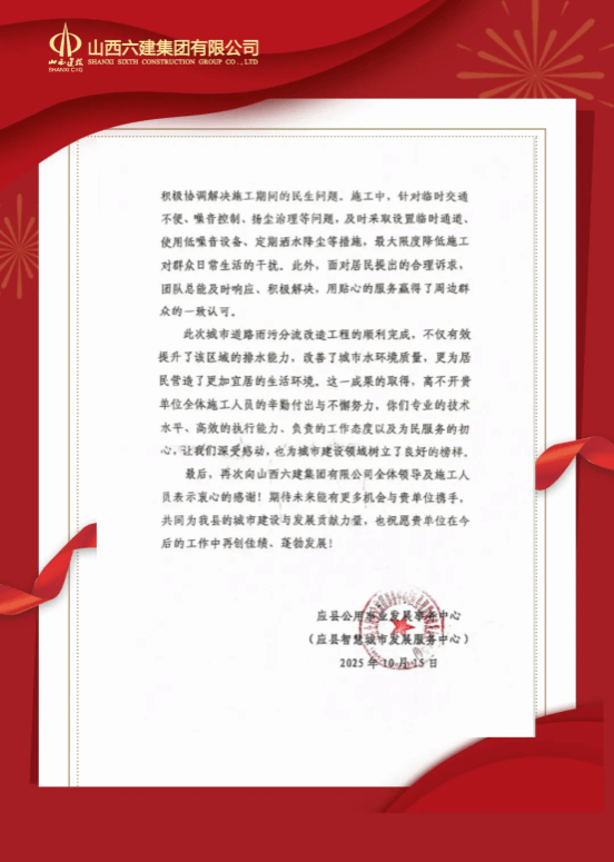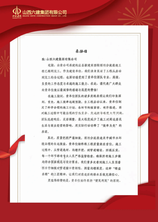 表扬信中指出,施工期间,项目建设团队通过科学规划与灵活调整,妥善应对管线复杂、交通疏导难等问题,最大程度降低对居民生活和商业经营的影响;坚守质量底线,从选材到施工各环节均严格把控,以精益求精的态度保障工程符合规范;秉持便民利民原则,通过设置临时通道、降尘降噪等措施,及时响应居民合理诉求,用贴心服务收获一致好评。应县公用事业发展事务中心(应县智慧城市发展服务中心)对全体施工人员的辛勤付出表示感谢,对山西六建集团专业的技术水平、高效的执行能力、负责的工作态度以及为民服务的初心表示高度赞扬,并期待未来继续携手助力地方城市建设。