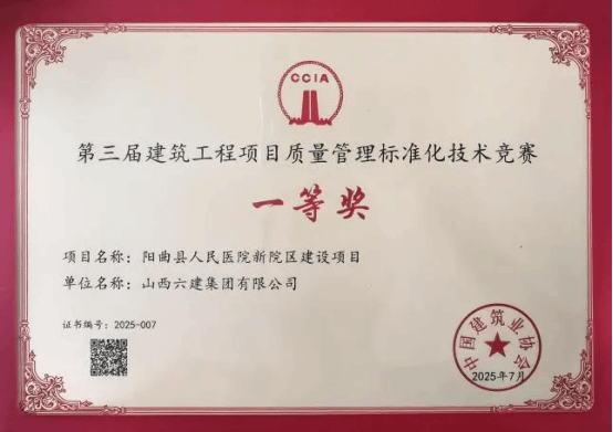 近日,由中国建筑业协会主办的第三届建筑工程项目质量管理标准化技术竞赛结果出炉,山西六建集团承建的阳曲县人民医院新院区建设项目及汾酒2030技改原酒产储能扩建项目(一期)总承包(EPC)项目,凭借过硬的质量管控与创新技术应用,双双斩获竞赛成果一等奖,在全国建筑行业舞台上彰显晋企实力。