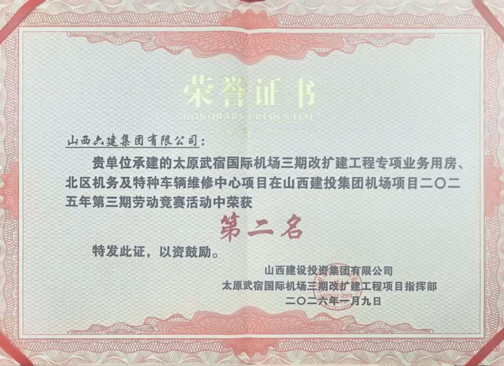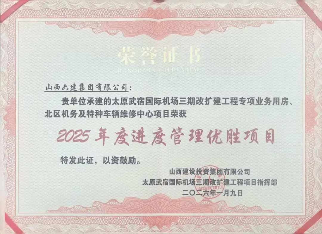山西六建集团承建的太原武宿国际机场三期改扩建工程专项业务用房、北区机务及特种车辆维修中心项目凭借卓越的进度管理能力,荣获“2025年度进度管理优胜项目”称号,并在山西建投集团机场项目2025年第三期劳动竞赛活动中取得第二名。