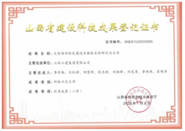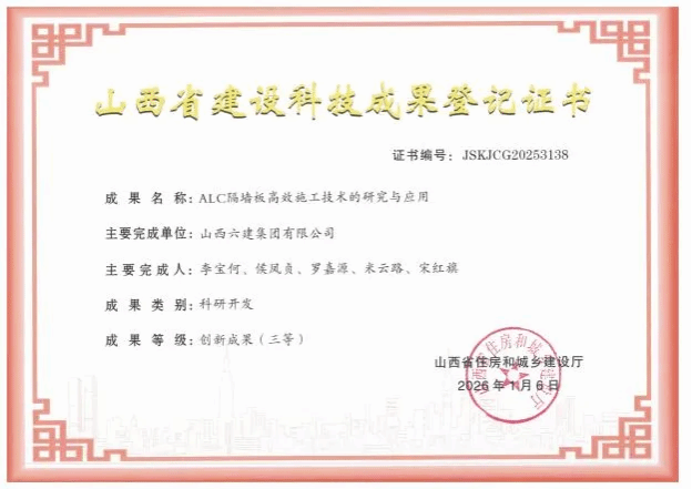 近日,山西省住房和城乡建设厅发布了2025年度建设科技成果登记目录,山西六建集团有限公司申报的3项建设科技成果准予登记,《大型公建智能建造关键技术》获重大成果(一等)、《大型场馆绿色建造关键技术的研究与应用》获优秀成果(二等),《ALC隔墙板高效施工技术的研究与应用》获创新成果(三等)。这是集团积极响应住建部智能建造和绿色建造双引擎号召,在推动“传统建造”向“智能建造”跃升过程中取得的丰硕成果。